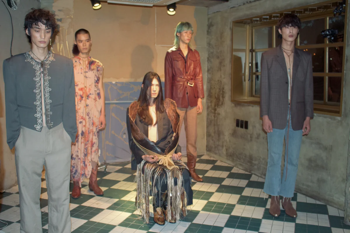 WINDOW 00’s Spring/Summer 2018 collection emphasized blazers and jackets embellished with leather belts, cowboy boots, flowers, fur, and hide wraps, revealing a westernwear theme with a contemporary twist. Along with the western concept, the collection contained an earthy color palette and design that complemented every garment. Pops of pastel pink color, flower crowns, and ruffled tunics gave the collection a femininity in touch with the blooming season.